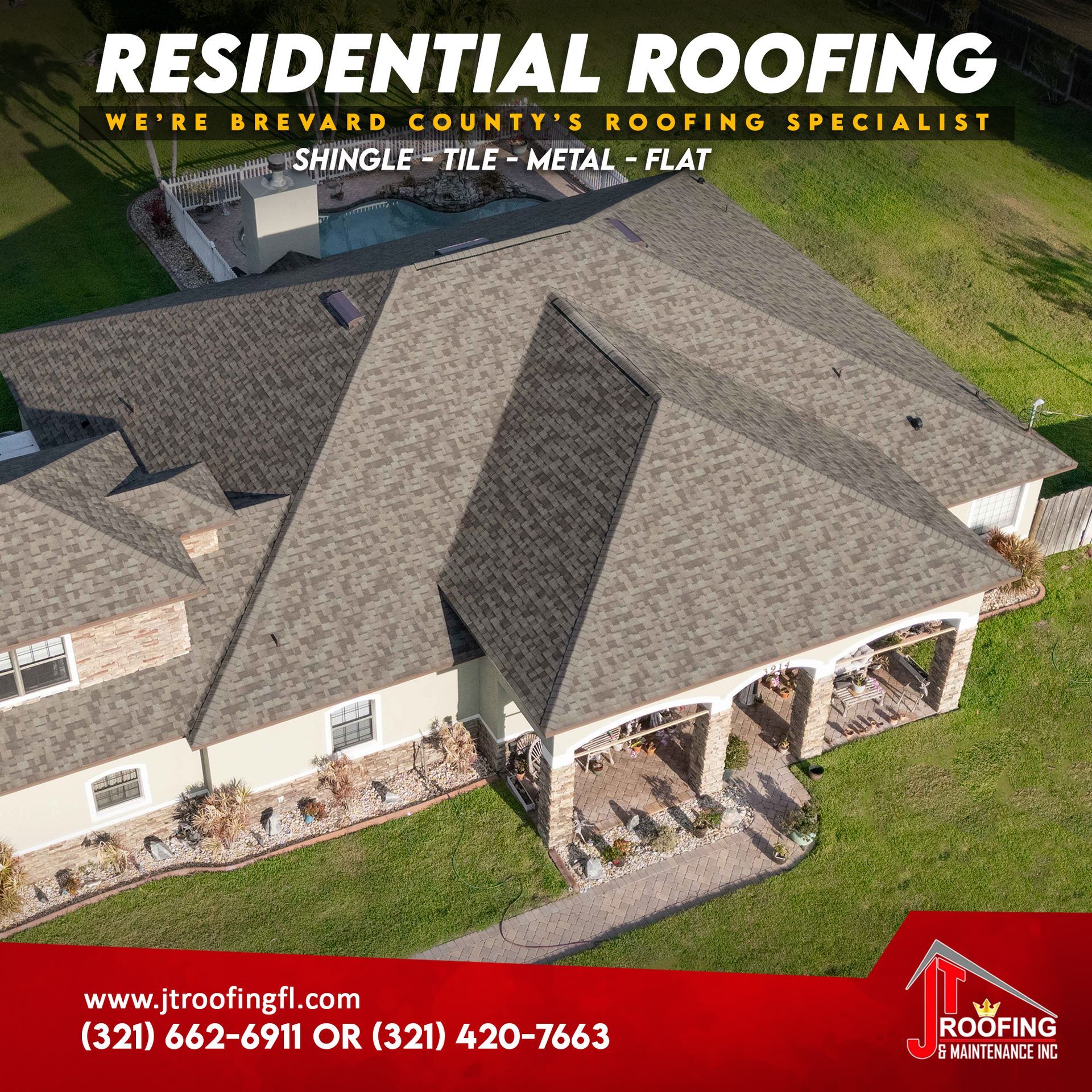 Roofing Prices in Melbourne FL & Palm Bay FL: What Homeowners Can Expect If you’re planning a roof replacement or new roof installation in Melbourne, Palm Bay, or anywhere in Brevard County , one of the first questions you’re likely asking is: How much does a new roof cost? At JT Roofing & Maintenance Inc., we believe in transparency. Below is a breakdown of average roofing prices per square (100 sq. ft.) for the most common roofing systems in our area. Average Roofing Costs in Melbourne & Palm Bay, FL 🔹 Shingle Roofing Prices $450 – $500 per square Asphalt shingles remain the most popular roofing choice for Florida homeowners due to affordability and reliability. Shingle roofing pricing includes : Tear-off and disposal Underlayment - Peel-and-stick vs Synthetic felt Architectural shingles (such as OC Duration) Professional installation Best for : Budget-friendly residential roofing with solid curb appeal. 🔹 Tile Roofing Prices $1,000 – $1,350 per square Tile roofing is a premium option known for longevity and hurricane resistance—very popular in Florida. Tile roofing pricing varies based on : Concrete vs clay tile Roof pitch and complexity Number of facets Structural requirements and code requirements Best for : Long-term durability and upscale homes. 🔹 Metal Roofing Prices $700 – $1,500 per square Metal roofing offers exceptional lifespan, energy efficiency, and wind resistance—ideal for Florida’s climate. Metal roof pricing depends on : Exposed fastener vs standing seam Color vs Mill Finished Gauge thickness - 26g, 24g, 22g Galvanized vs Galvalume vs Aluminum Roof design and penetrations Code Requirements Best for : Homeowners seeking longevity, storm resistance, and modern style. 🔹 Flat & Low-Slope Roofing Prices $650 – $1,500 per square Flat roofing systems are commonly used for commercial buildings and some residential applications. Flat roofing systems include : TPO Roofing Modified Bitumen PVC Roofing Pitch of roof Tapered vs flat insulation Deck types - post tension concrete, precast concrete, wood, steel, gypsum, tectum, light weight concrete Mechanically fastened vs fully adhered Best for : Commercial properties and low-slope residential roofs . What Affects Roofing Costs in Brevard County? While the ranges above are accurate for Melbourne FL and Palm Bay FL , final pricing can vary based on: Roof size and pitch Tear-off requirements Decking repairs Material upgrades Permits and inspections That’s why on-site inspections are essential for accurate estimates. Why Choose JT Roofing & Maintenance Inc.? ✔ Licensed & insured Florida roofing contractor ✔ Residential & commercial roofing experts ✔ High-quality materials ✔ Honest pricing with no surprises ✔ Financing options available We proudly serve Palm Bay, Melbourne, West Melbourne, Melbourne Beach, and surrounding Brevard County areas . Get a Free Roofing Estimate Today If you’re considering a new roof or replacement, trust the professionals at JT Roofing & Maintenance Inc. to provide accurate pricing and expert workmanship. 📞 Call today to schedule your free roof inspection and estimate 🏠 Serving Melbourne FL & Palm Bay FL